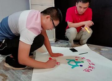 最后,在周书记的主持下,70位教师分成7个小组展开行与思团建活动。各位教师以小组为单位,齐心协力设计出风格各异和寓意丰富的小组海报和口号, 充分展现了新时代乡村初中物理教师的风采。